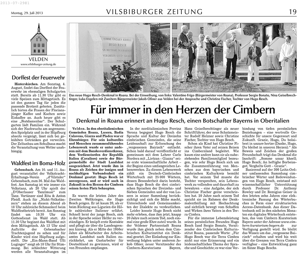 Denkmal in Roana erinnert an Hugo Resch, einen Botschafter Bayerns in Italien